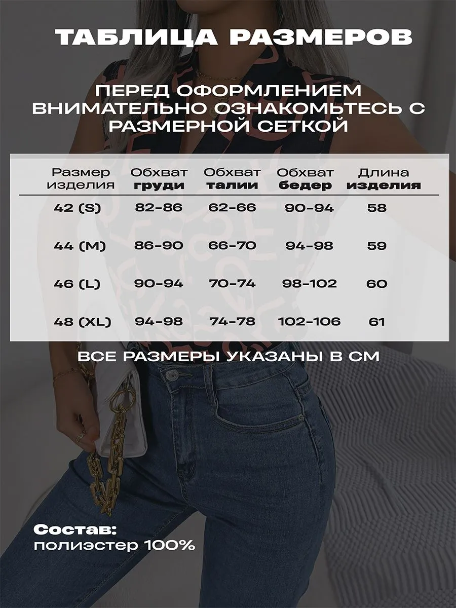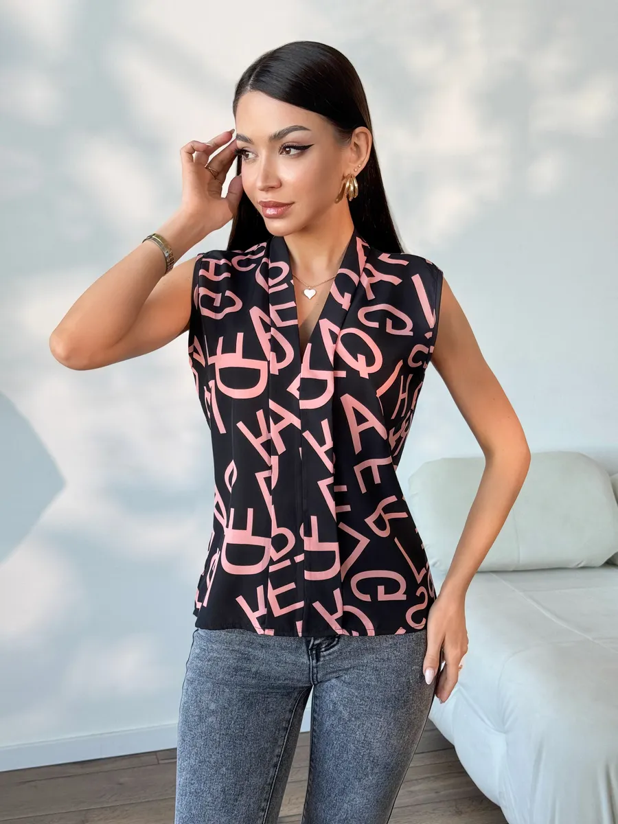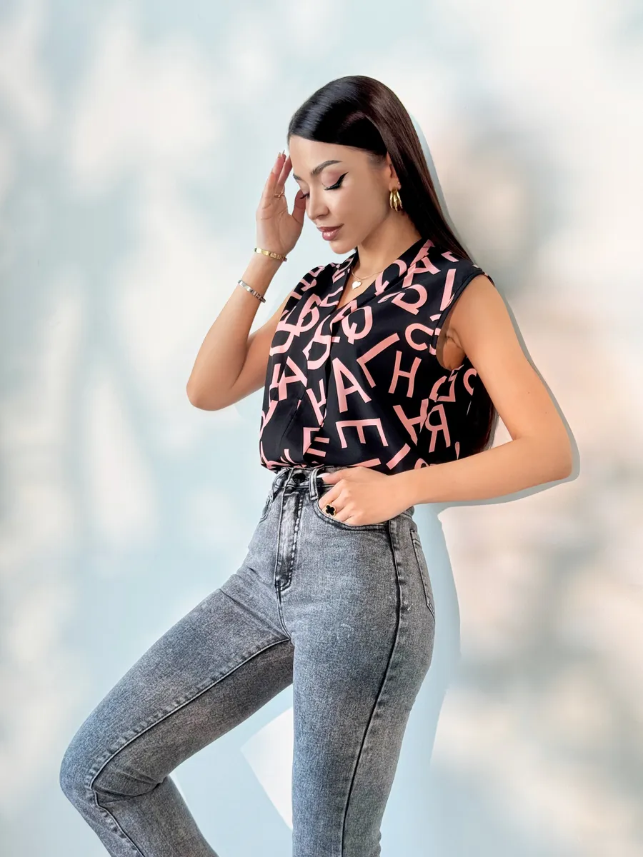 Элегантная женская вещь без рукава станет идеальным вариантом в офис и на каждый день. Модель имеет V-образный вырез и украшена принтом. Темная блуза легкая, поэтому подойдет на лето и весну. Ее можно носить как школьную или на учебу. Блузка прямого кроя нарядная, поэтому она подойдет как вечерняя на встречу с друзьями или на прогулку. Стильная модель будет актуальна девушкам и женщинам старшего возраста. Ее можно носить как офисную или повседневную. Блузка топ подойдет как летняя и весенняя. С ней можно создавать многослойные образы и оставаться в тренде. Изысканный вырез подчеркнет зону декольте, а свободный крой поможет скрыть возможные недостатки фигуры.