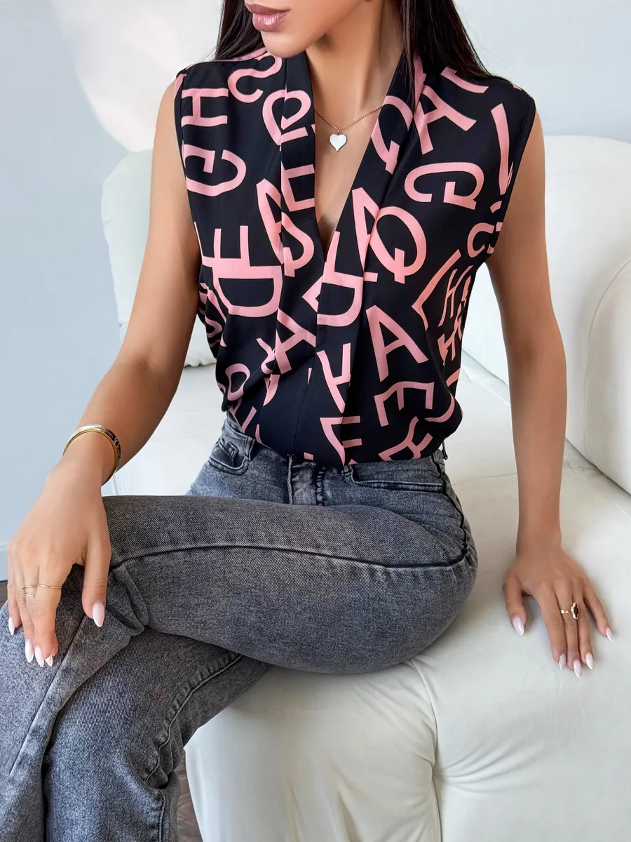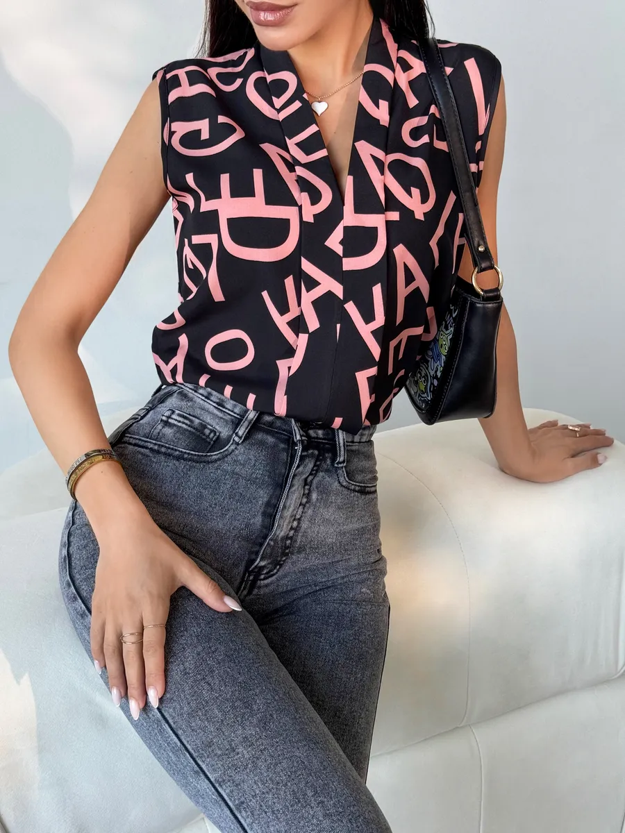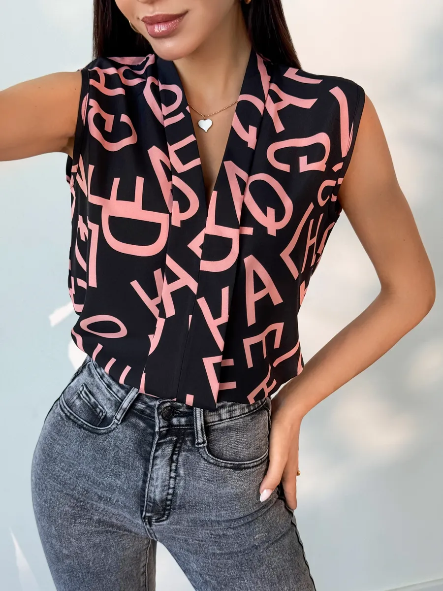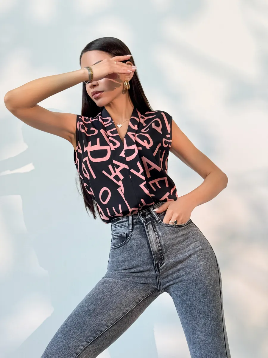 Элегантная женская вещь без рукава станет идеальным вариантом в офис и на каждый день. Модель имеет V-образный вырез и украшена принтом. Темная блуза легкая, поэтому подойдет на лето и весну. Ее можно носить как школьную или на учебу. Блузка прямого кроя нарядная, поэтому она подойдет как вечерняя на встречу с друзьями или на прогулку. Стильная модель будет актуальна девушкам и женщинам старшего возраста. Ее можно носить как офисную или повседневную. Блузка топ подойдет как летняя и весенняя. С ней можно создавать многослойные образы и оставаться в тренде. Изысканный вырез подчеркнет зону декольте, а свободный крой поможет скрыть возможные недостатки фигуры.