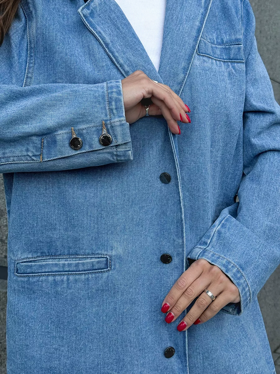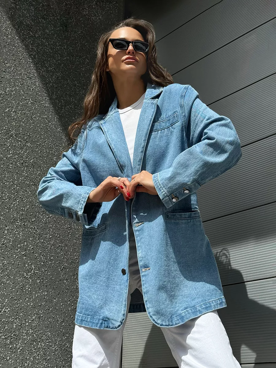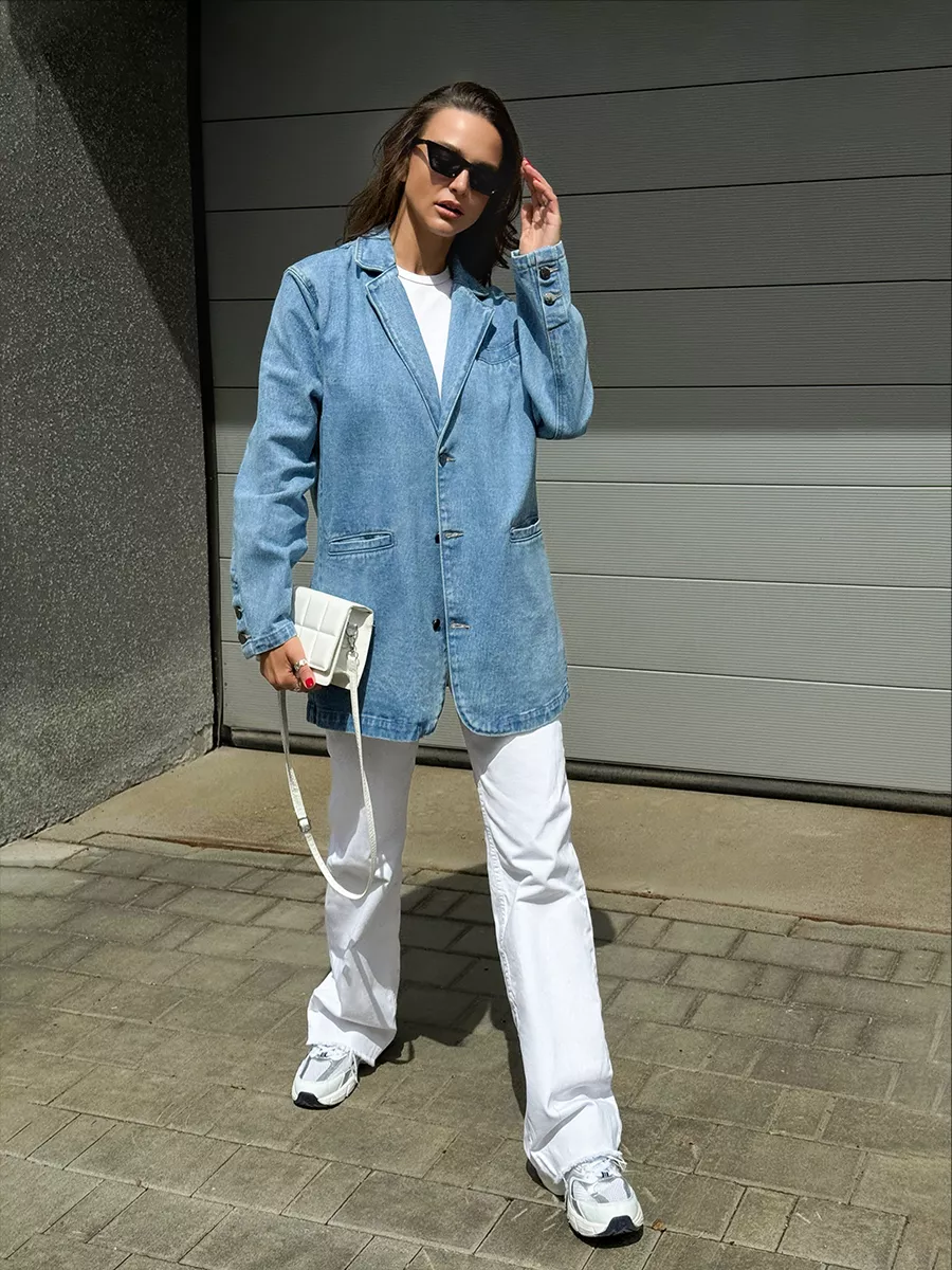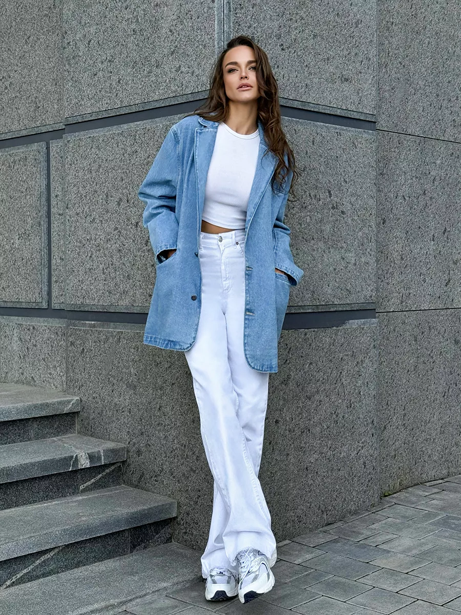 Эта женская модель создаст трендовый образ и защитит от холода в весной и летом. Пиджак с плечами - это стильный и модный вариант, подходящий для любого случая. Куртка может быть актуальна для классических и более формальных образов в стиле кэжуал. Необычный, при этом универсальный вариант подходит для повседневной носки. Блейзер оверсайз - тренд последних сезонов. В удлиненном пиджаке будет удобно и комфортно весь день. Жакет деним имеет прорезные карманы и один декоративный, благодаря чему он функциональный и смотрится очень стильно. Джинсовка выполнена в светло-голубом цвете. Вещи из плотной джинсы - модный тренд сезона в стиле гранж.
