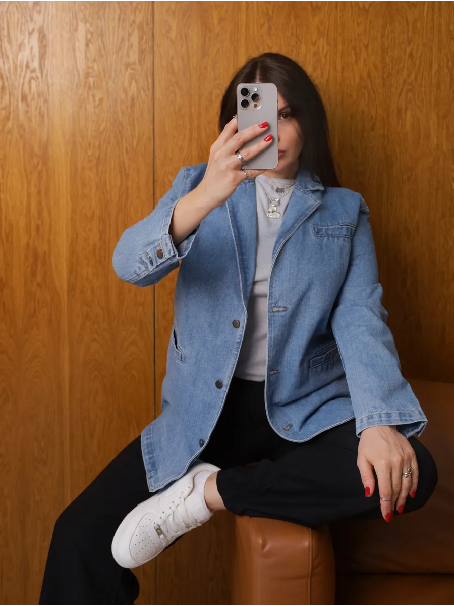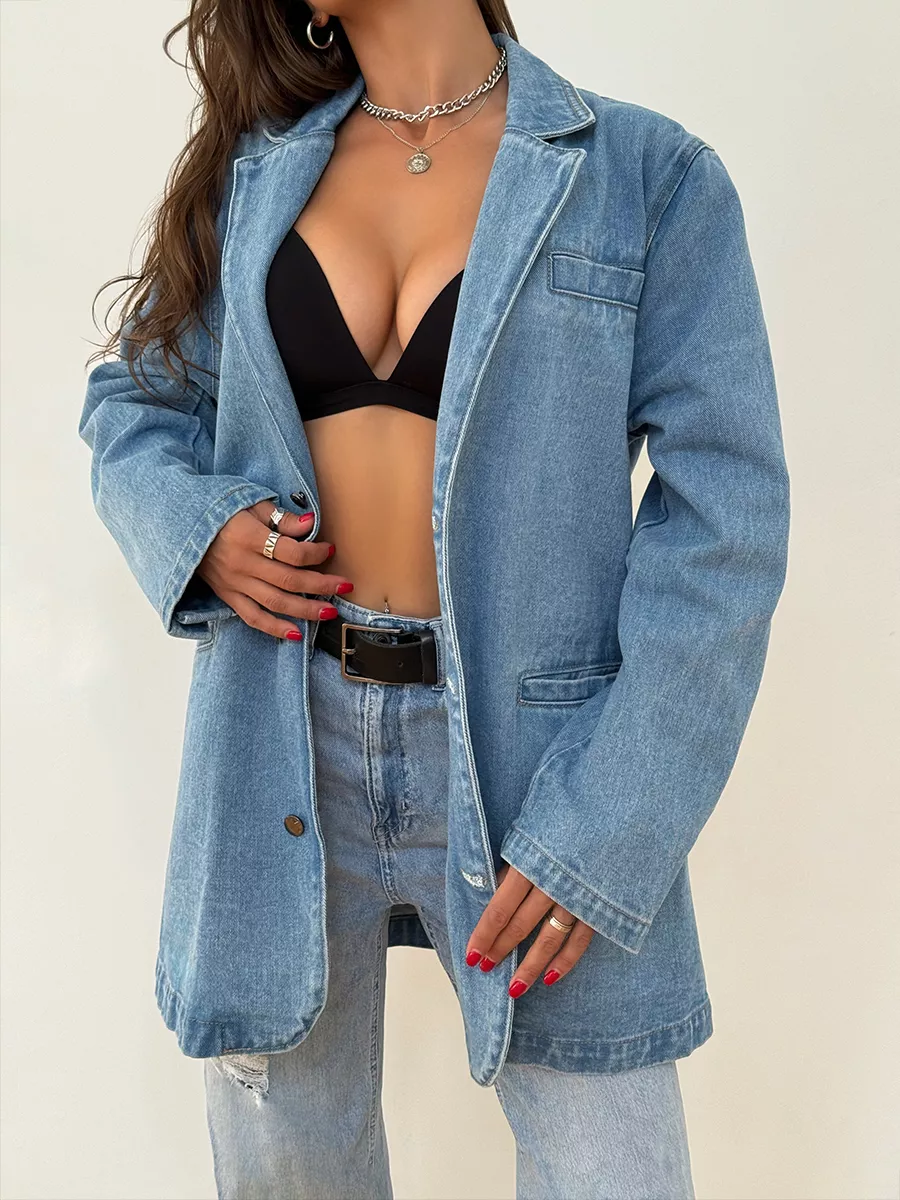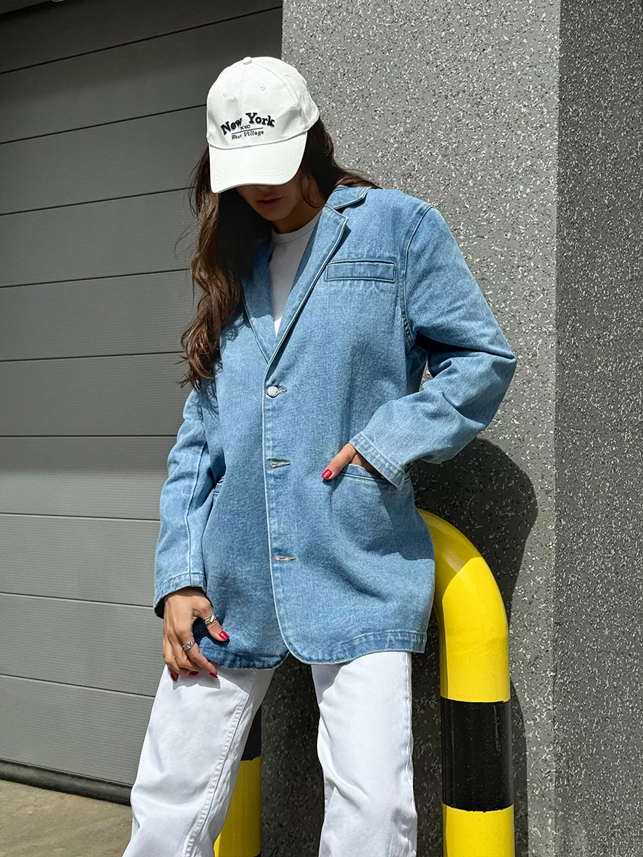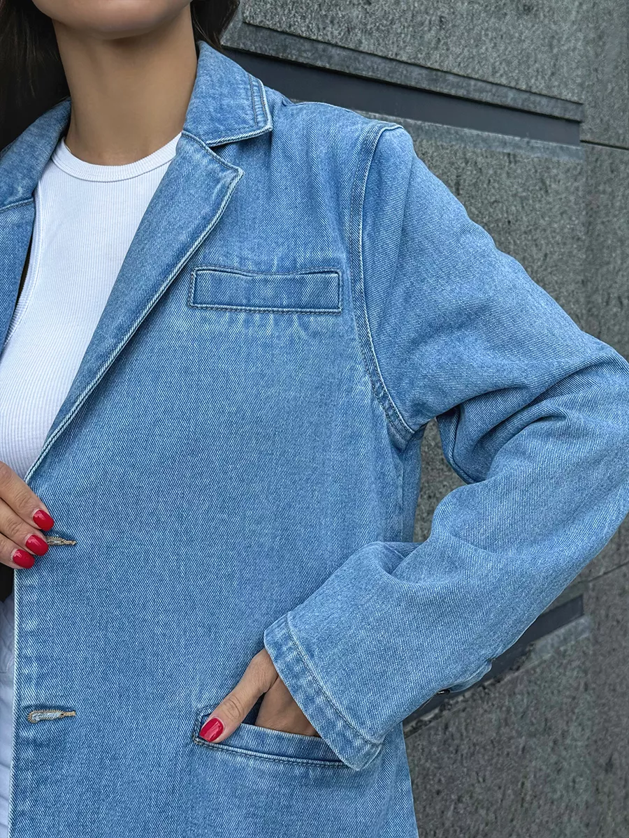 Эта женская модель создаст трендовый образ и защитит от холода в весной и летом. Пиджак с плечами - это стильный и модный вариант, подходящий для любого случая. Куртка может быть актуальна для классических и более формальных образов в стиле кэжуал. Необычный, при этом универсальный вариант подходит для повседневной носки. Блейзер оверсайз - тренд последних сезонов. В удлиненном пиджаке будет удобно и комфортно весь день. Жакет деним имеет прорезные карманы и один декоративный, благодаря чему он функциональный и смотрится очень стильно. Джинсовка выполнена в светло-голубом цвете. Вещи из плотной джинсы - модный тренд сезона в стиле гранж.