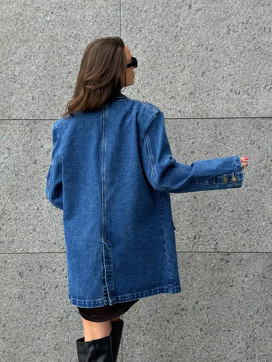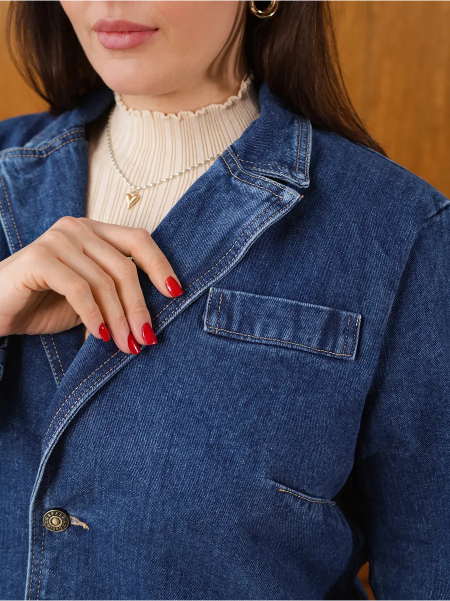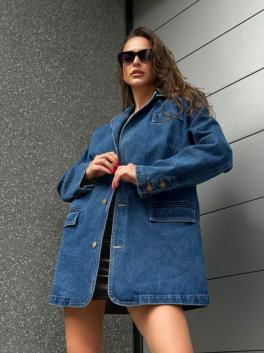 Эта женская модель создаст трендовый образ и защитит от холода в весной и летом. Пиджак с плечами - это стильный и модный вариант, подходящий для любого случая. Куртка может быть актуальна для классических и более формальных образов в стиле кэжуал. Необычный, при этом универсальный вариант подходит для повседневной носки. Блейзер оверсайз - тренд последних сезонов. В удлиненном пиджаке будет удобно и комфортно весь день. Жакет деним имеет прорезные карманы и один декоративный, благодаря чему он функциональный и смотрится очень стильно. Джинсовка выполнена в темно-синем цвете. Вещи в оттенке raw denim ("сырой" деним) - модный тренд сезона в стиле гранж.