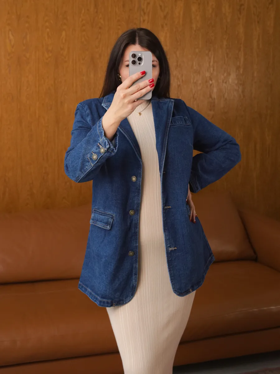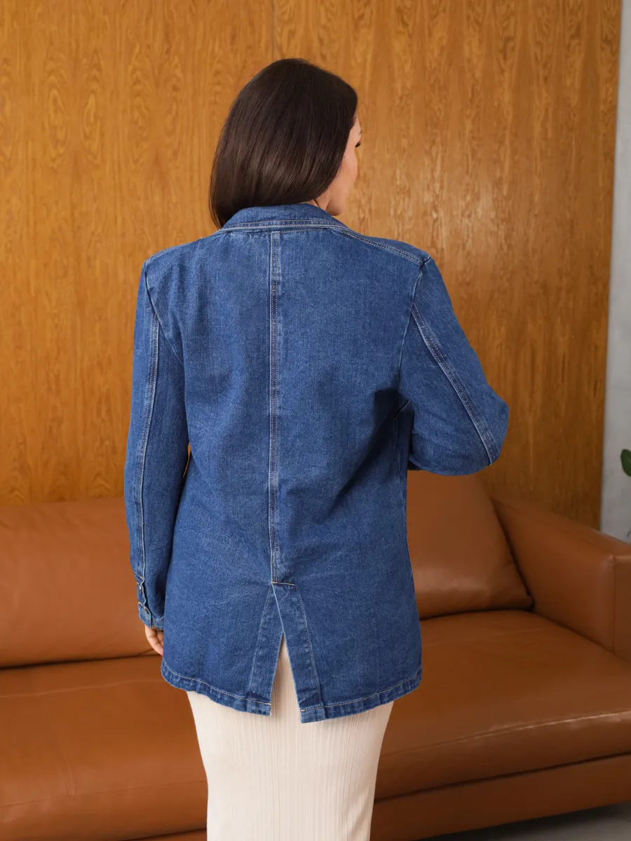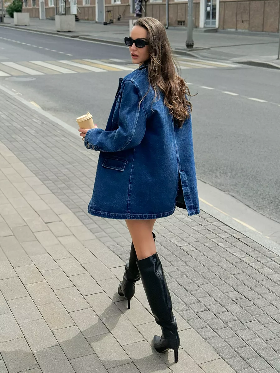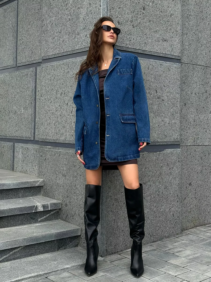 Эта женская модель создаст трендовый образ и защитит от холода в весной и летом. Пиджак с плечами - это стильный и модный вариант, подходящий для любого случая. Куртка может быть актуальна для классических и более формальных образов в стиле кэжуал. Необычный, при этом универсальный вариант подходит для повседневной носки. Блейзер оверсайз - тренд последних сезонов. В удлиненном пиджаке будет удобно и комфортно весь день. Жакет деним имеет прорезные карманы и один декоративный, благодаря чему он функциональный и смотрится очень стильно. Джинсовка выполнена в темно-синем цвете. Вещи в оттенке raw denim ("сырой" деним) - модный тренд сезона в стиле гранж.