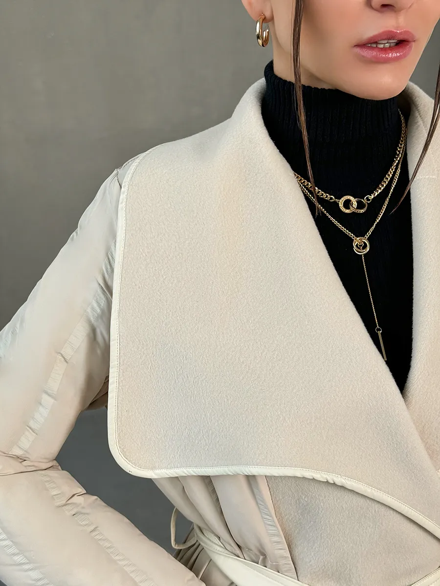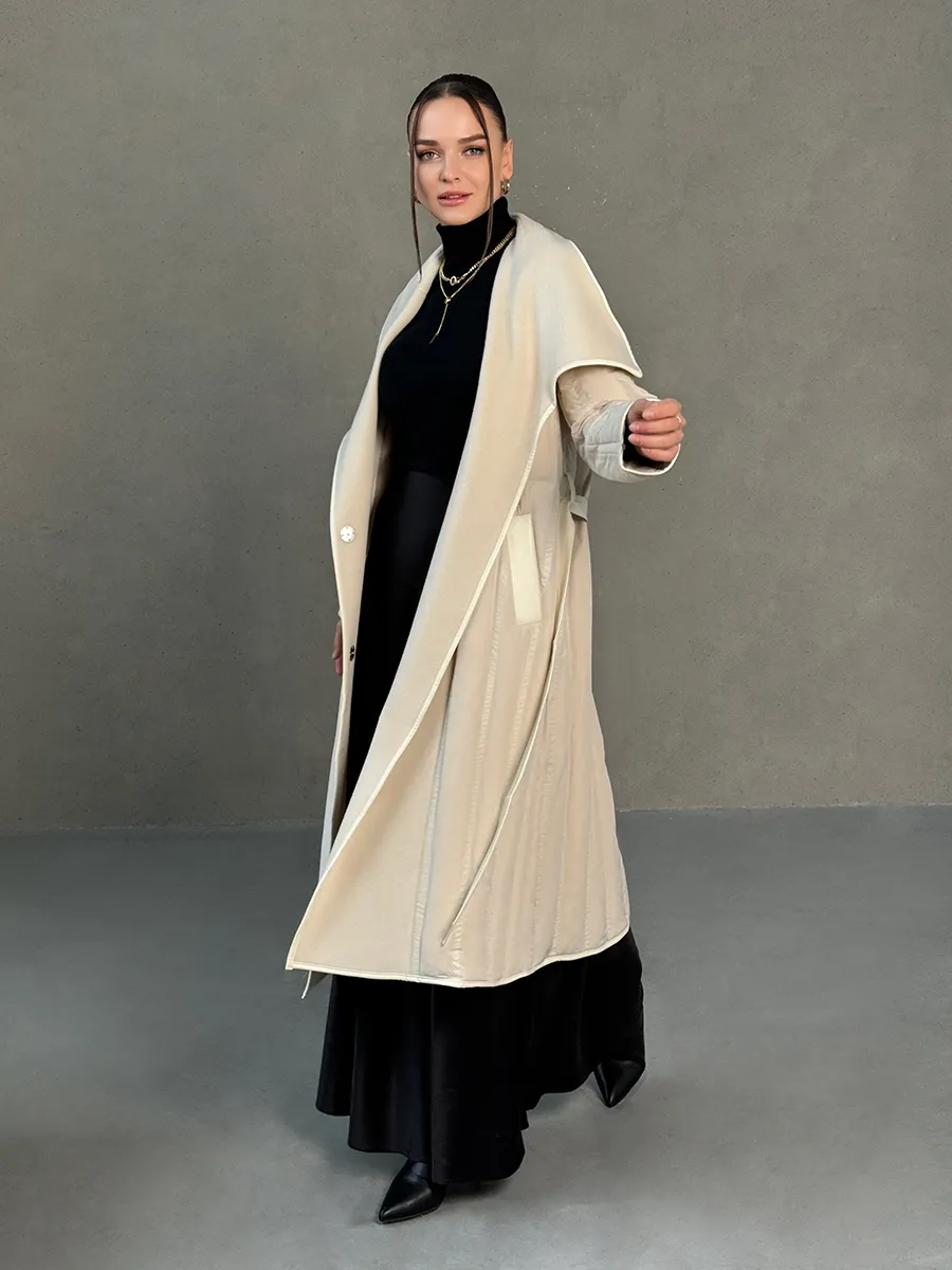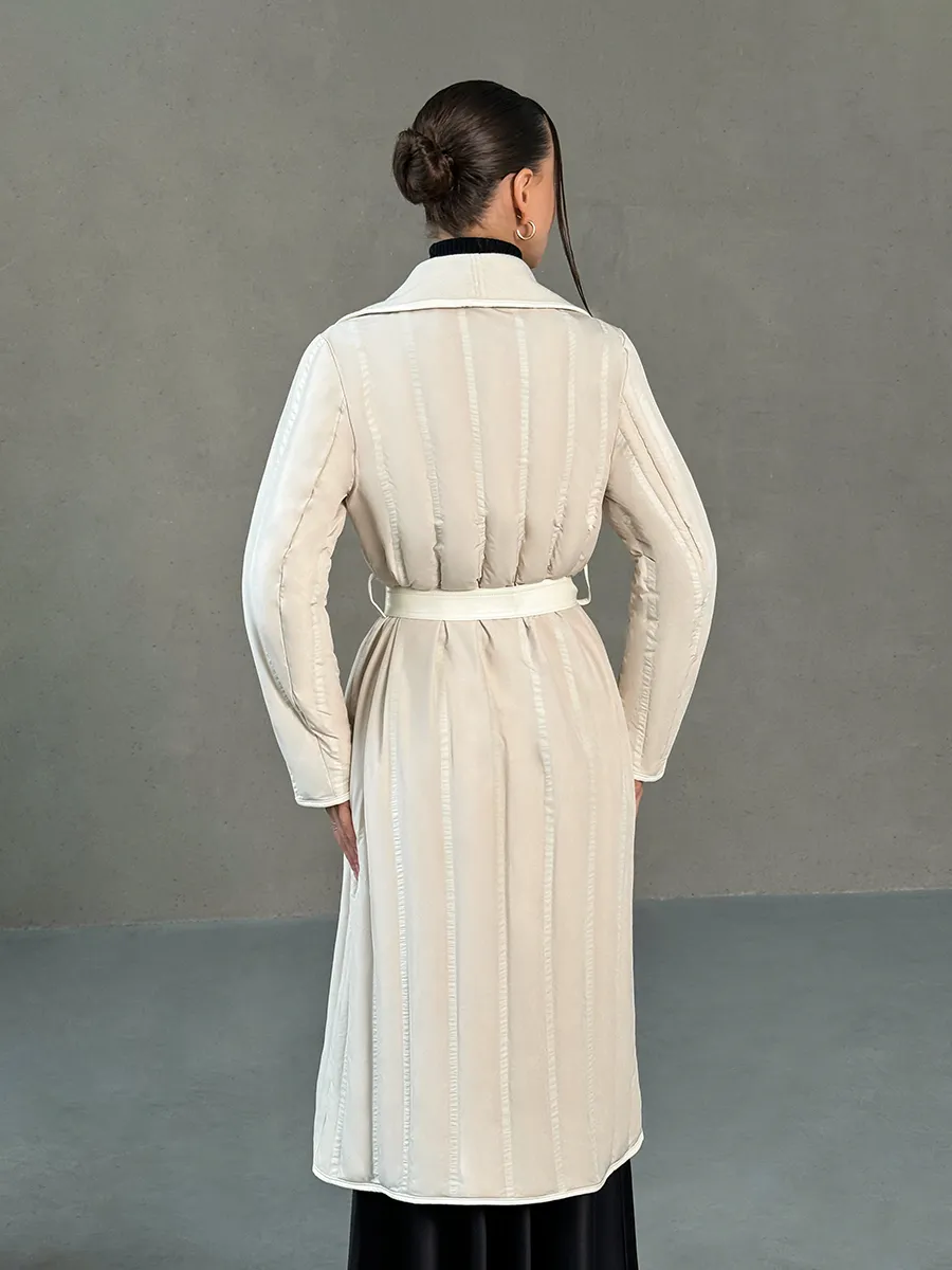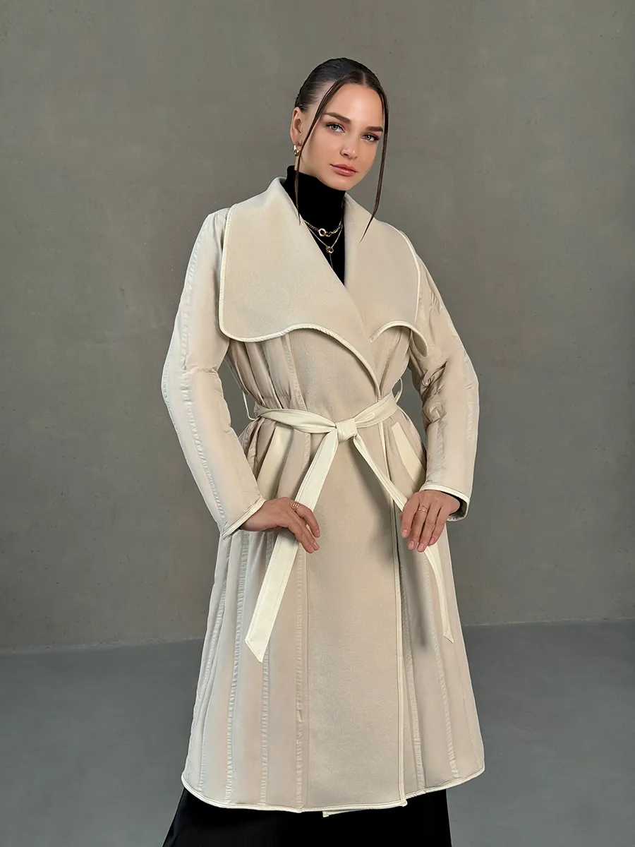 Классический плащ подойдет на осень и весну 2025. За счет пояса модель имеет приталенный крой, который подчеркивает фигуру и делает образ более изящным и нежным. В то же время, вариант выполнен в строгом деловом стиле. Стеганная модель миди обеспечивает максимальную теплоизоляцию и комфорт. Комбинированный плащ халат имеет утеплитель из натурального пуха. Он теплый и защитит от холода. Декоративным элементом является английский воротник, который добавит образу элегантности. Утепленный осенне-весенний вариант обеспечивает комфорт на протяжении всего дня. Куртка выполнена в светлом оттенке. Стильный дизайн и модный цвет сделают образ молодежным и незабываемым.
