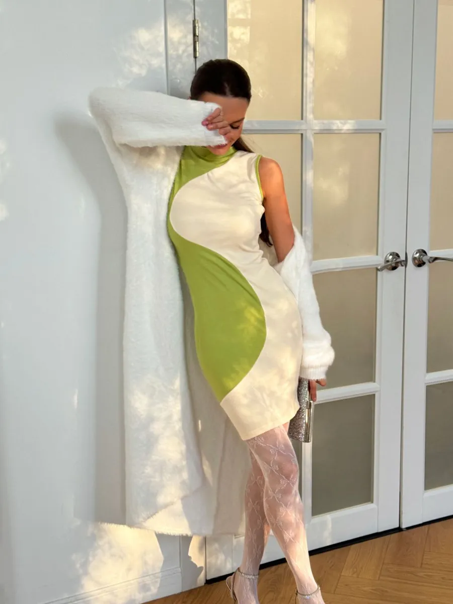 Элегантная модель в обтяжку станет отличным дополнением гардероба на осень. Она выполнена без рукава и имеет облегающий крой. Двухцветное платье лапша подойдет на каждый день. Длина мини и эластичная ткань делают его комфортным в повседневной носке. Засчет этого, изделие могут носить женщины любого телосложения и высокие девушки. Оно станет отличным выбором для вечеринки с коктейльным дресс-кодом или похода в ресторан. Платье украшено воротником стойкой и рюшами. Оно выполнено в пастельных тонах, поэтому может быть использовано для более официальных выходов. Изделие обтягивающее и имеет длину выше колена. Это поможет подчеркнуть все достоинства фигуры. Модель с горлом - сочетание комфорта и стиля. Она дополнит собой легкие весенние и зимние образы на работу или учебу. Отсутствие подклада делает его комфортным, оно идеально для корпоратива или Нового года.