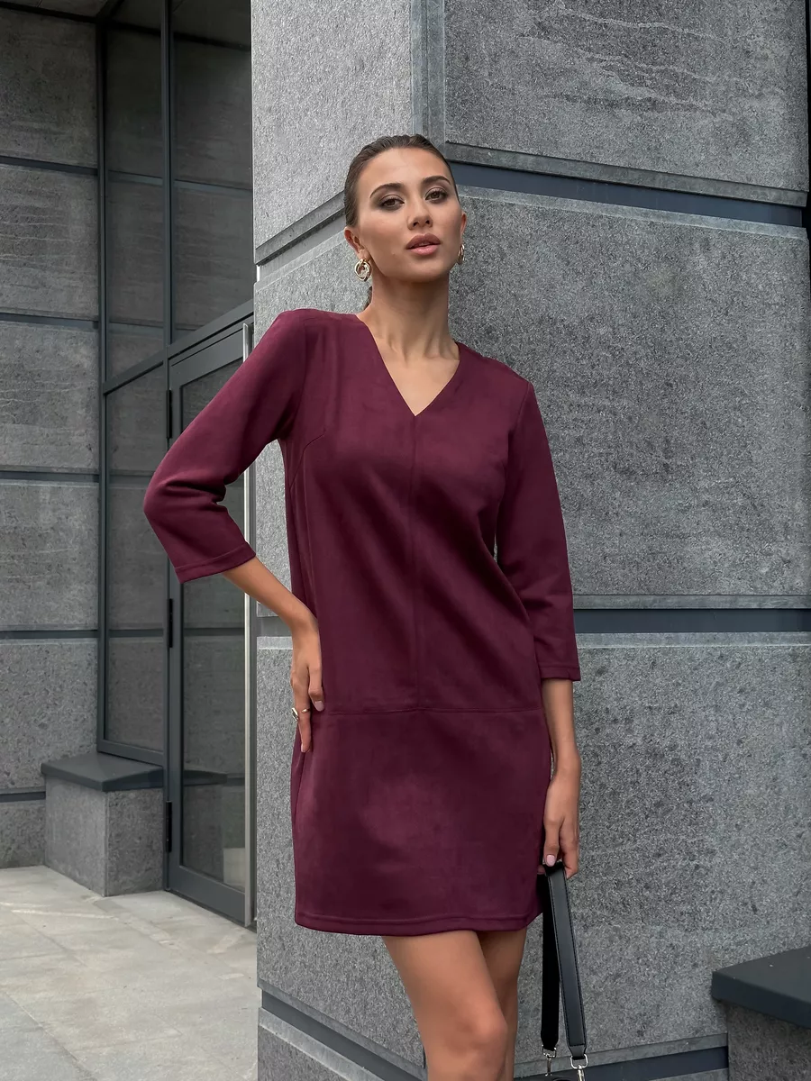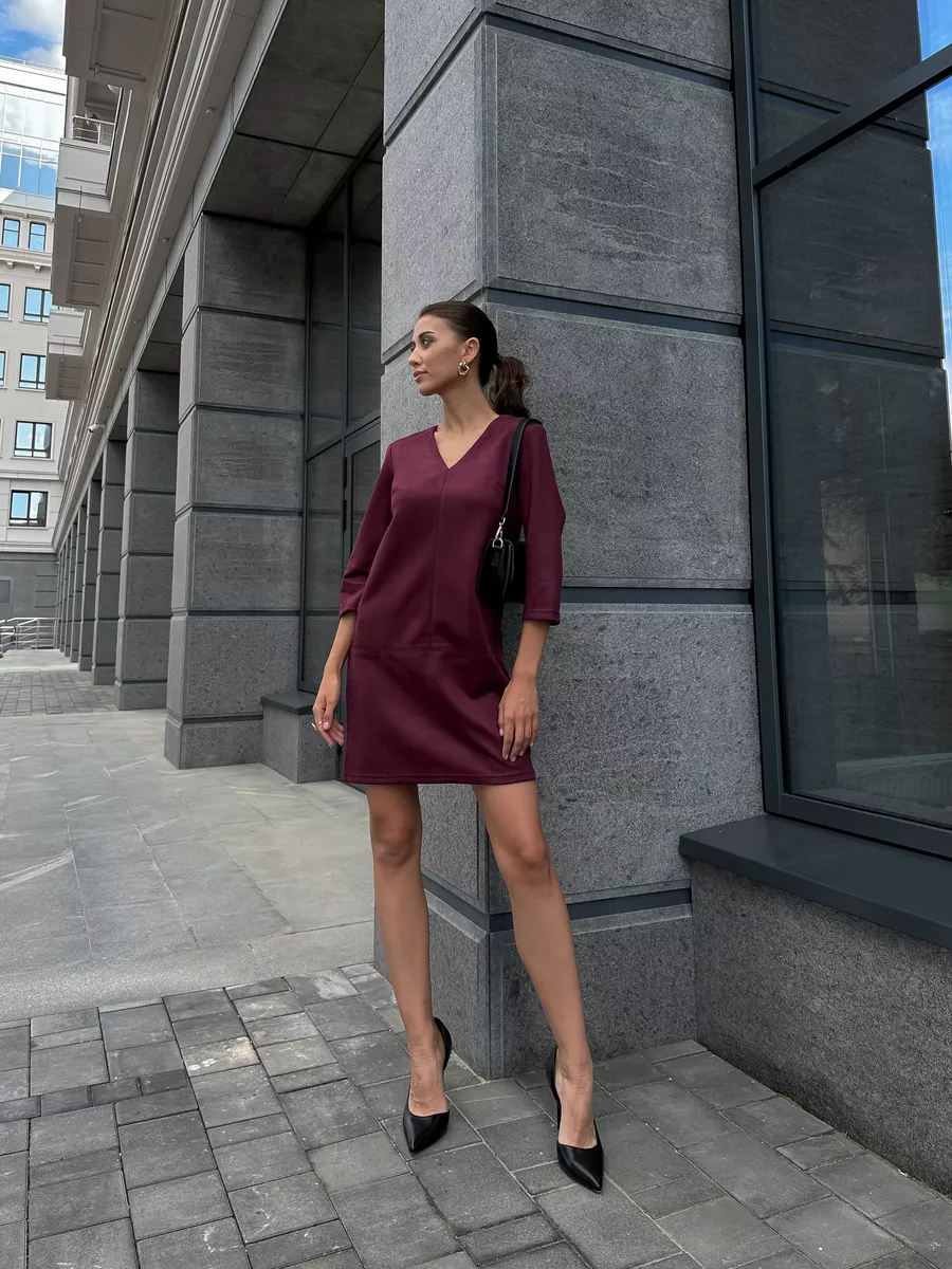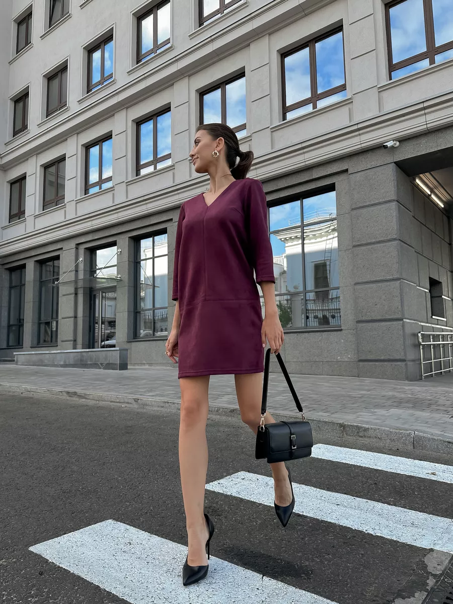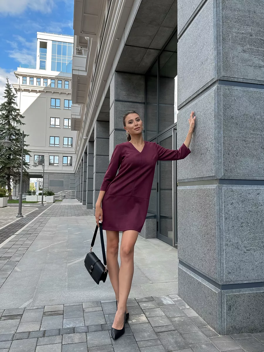 Эта модель входит у модниц в топ теплых платьев на осенний день. Будучи базовым демисезонное платье не выглядит скучно - за счёт интересного выреза с V-образной прорезью. Его можно надеть в офис на работу или учёбу. В сочетании с туфлями оно выглядит как вечернее или праздничное на выпускной. Силуэт - с акцентом на ноги, поэтому теплое платье подойдёт для любой фигуры, даже для беременных. Это нарядное платье короткое, с рукавом 3/4, что позволяет носить его в любое время года, в том числе и на холодную осень. Модель подойдет на день рождения и юбилей. Модель подойдет как школьный аутфит или в офис. Платье прямого кроя подойдет для девушек и женщин больших размеров и для беременных.