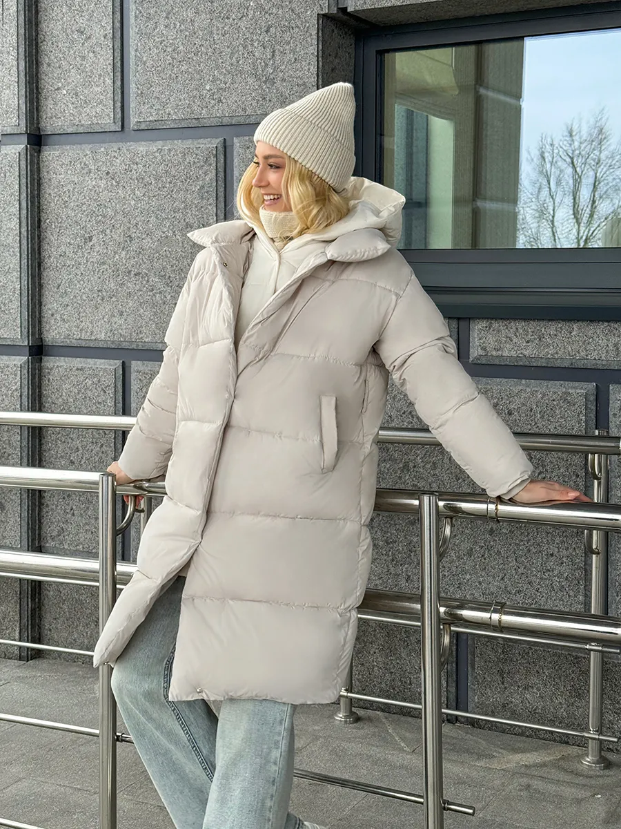 Стильный вариант дополнит базу гардероба на зимний период. Пуховик прямого кроя и имеет свободную посадку оверсайз. Он поможет скрыть возможные недостатки фигуры и подарит свободу движений. Он дополнен поясом, засчет которого вы можете самостоятельно регулировать внешний вид изделия. Теплый пуховик с утеплителем из вискозы обеспечит максимальную ветрозащиту в холодное время года. Он двухслойный: оснащен нижний слоем на кнопках и капюшоном. Комфортная длина до колена и рукава со внутренними манжетами обеспечат комфорт при каждом использовании. Светлая куртка дутой формы подходим для еврозимы. Она универсальна для повседневных образов или более активных видов отдыха. С ней вы можете создавать наряды в стиле пинтерест, создавая милый силуэт зефирка.