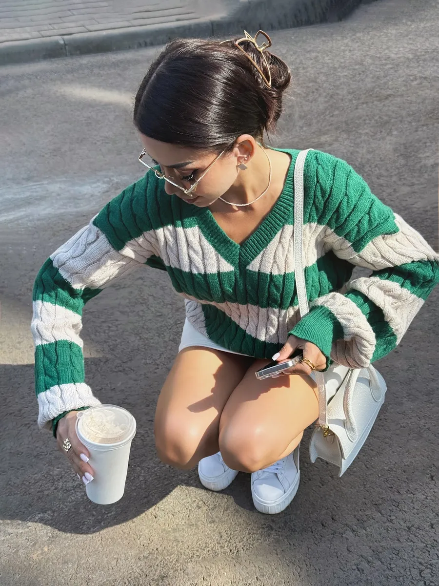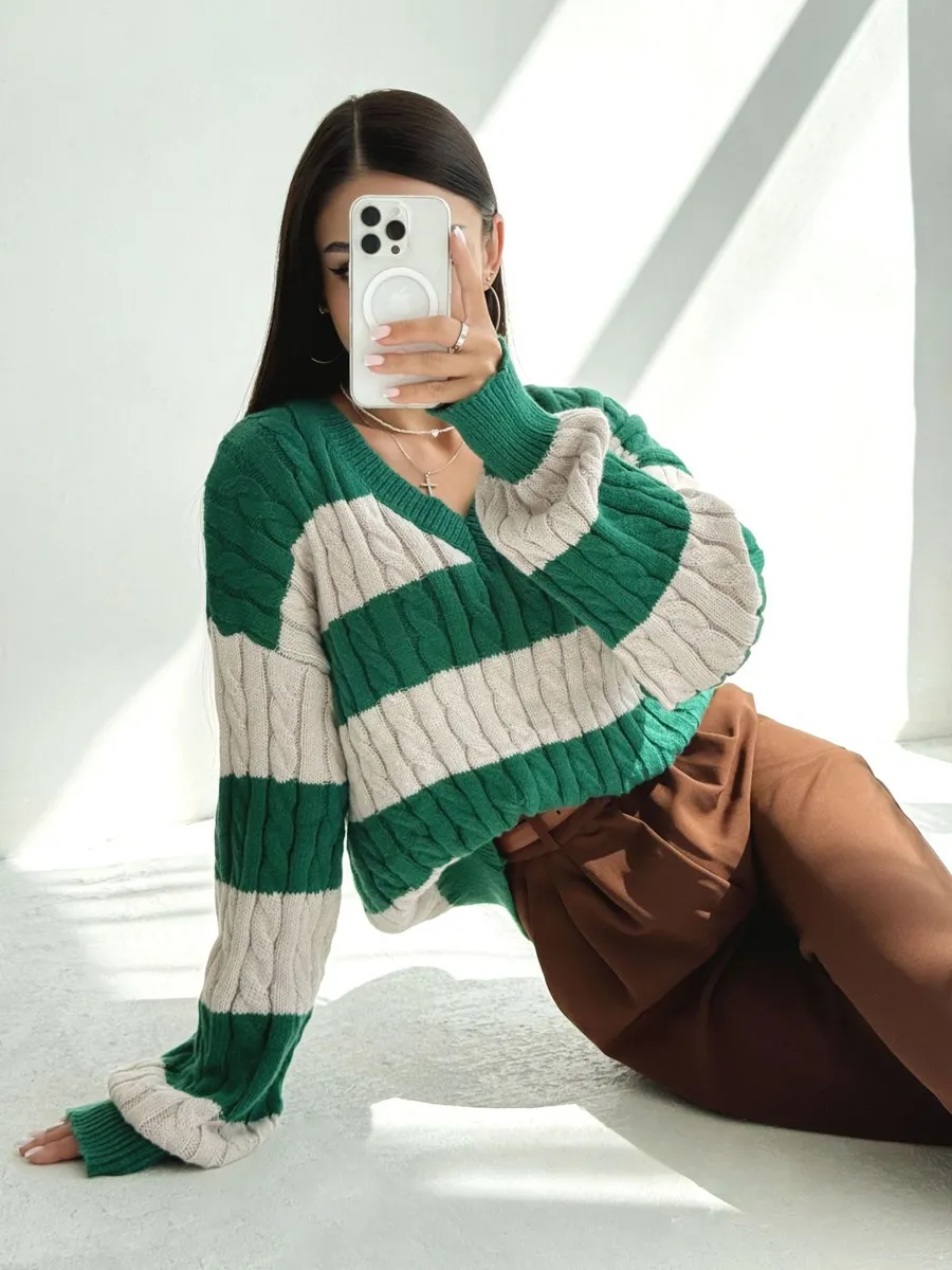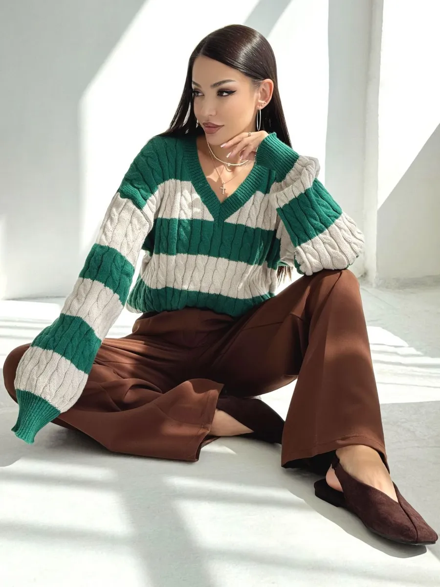Утепленный свитер женский оверсайз - это символ уюта, комфорта и стиля. Свободный крой вещей обеспечивает свободу движений, при этом трикотажный джемпер в корейском стиле подчеркивает женственность и добавляет образу нежности на учебу в школу. Необычный двухцветный пуловер с вырезом v (в) подойдет для прохладных осенних и зимних дней. Вязаный свитер фактурной вязки мягкий и милый, поэтому сможет стать частью теплых офисных образов. Свитер с легкостью дополнит образ на Новый год змеи, его цвет и дизайн как никогда актуален в 2025 году. Эстетичная кофта с косами подойдет как повседненвая для девушек и женщин постарше. Классическая модель трикотаж имеет принт в полоску и V-образный вырез. Полосатый модный свитер косичка обеспечит комфорт на весь период и создаст расслабленный школьный образ для девочки подростка. Молодежная кофточка с широкими рукавами фонариками подходит для создания уютного и стильного образа. Теплый свитер с принтом - трендовая классика, которая никогда не выходит из моды.